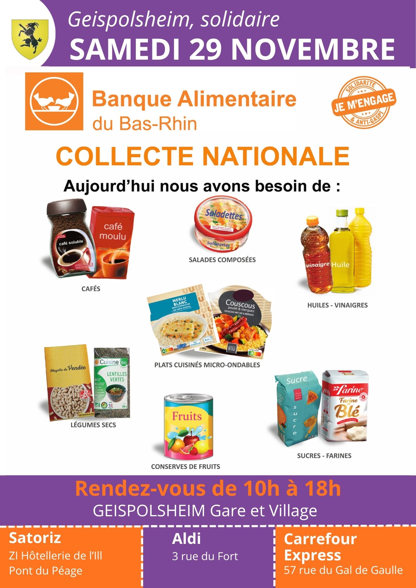 La Municipalité soutient la collecte de la Banque alimentaire du Bas-Rhin et y participera le Samedi 29 novembre de 10h à 18h sur Geispolsheim.